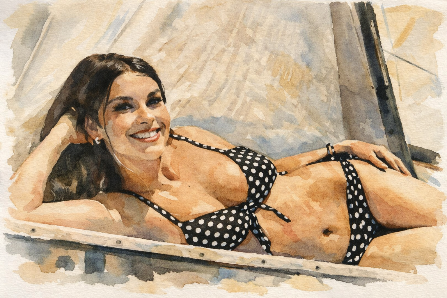 The photo above is a watercolor treatment of a photo of Paige from a press photo circa 1969 taken at the Lake Havasu 1969 Desert Regatta. This is for Diana Cotterell.